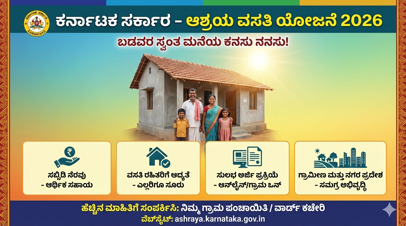 ಪ್ರತಿಯೊಬ್ಬ ವ್ಯಕ್ತಿಗೂ ತನ್ನದೊಂದು ಪುಟ್ಟ ಮನೆ ಇರಬೇಕು ಎಂಬುದು ಜೀವನದ ದೊಡ್ಡ ಕನಸು. ಈ ಕನಸನ್ನು ನನಸು ಮಾಡಲು ಕರ್ನಾಟಕ ಸರ್ಕಾರವು ಆಶ್ರಯ ವಸತಿ ಯೋಜನೆ (Ashraya Vasathi Scheme) ಮೂಲಕ ಆರ್ಥಿಕವಾಗಿ ಹಿಂದುಳಿದ ಕುಟುಂಬಗಳಿಗೆ ನೆರವು ನೀಡುತ್ತಿದೆ. 2026ರ ಹೊತ್ತಿಗೆ ರಾಜ್ಯದ ಪ್ರತಿಯೊಬ್ಬ ನಿವೇಶನ ರಹಿತರಿಗೂ ವಸತಿ ಕಲ್ಪಿಸುವುದು ಈ ಯೋಜನೆಯ ಮುಖ್ಯ ಗುರಿಯಾಗಿದೆ.